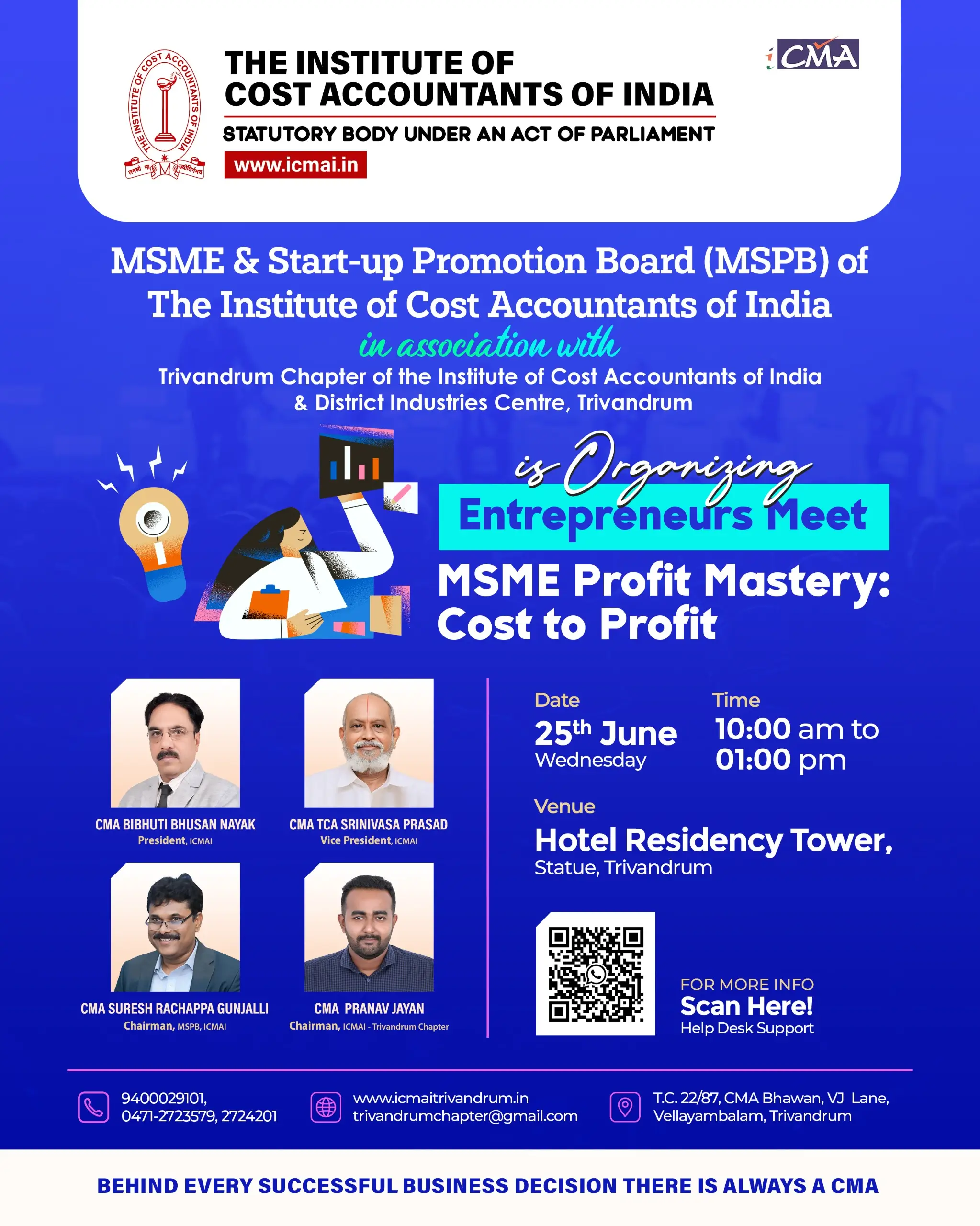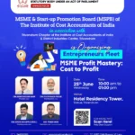 In an inspiring initiative to empower entrepreneurs and promote business growth, the MSME & Start-up Promotion Board (MSPB) of The Institute of Cost Accountants of India (ICMAI) is organizing an exclusive Entrepreneurs Meet titled “MSME Profit Mastery: Cost to Profit”.